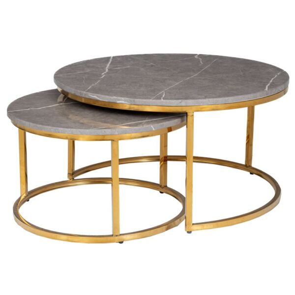 ΣΕΤ 2 ΧΡΥΣΟ ΜΕΤΑΛΛΙΚΟ ΣΤΡΟΓΓΥΛΟ ΤΡΑΠΕΖΙ ΜΕ ΓΚΡΙ ΕΠΙΦΑΝΕΙΑ ΜΕ ΕΦΕ ΜΑΡΜΑΡΟΥ Φ80Χ42,5 Φ60Χ36,5ΕΚ