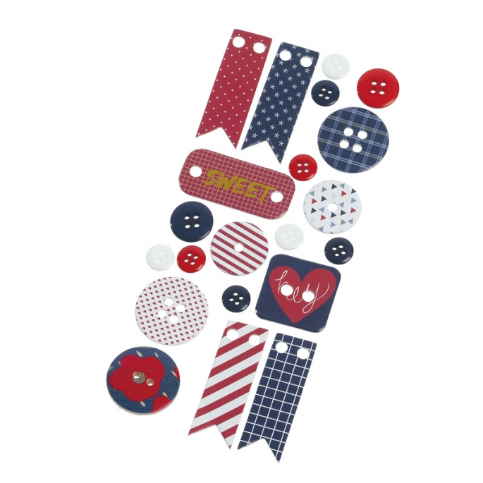 Καρτέλα με 8 διαφορετικά διακοσμητικά.Κυρίαρχες αποχρώσεις είναι το λευκό,το μπλε & το κόκκινο. Κάθε καρτέλα περιέχει 21 ξύλινα,πλαστικά και χάρτινα κουμπιά αλλά και χάρτινα αυτοκόλλητα.