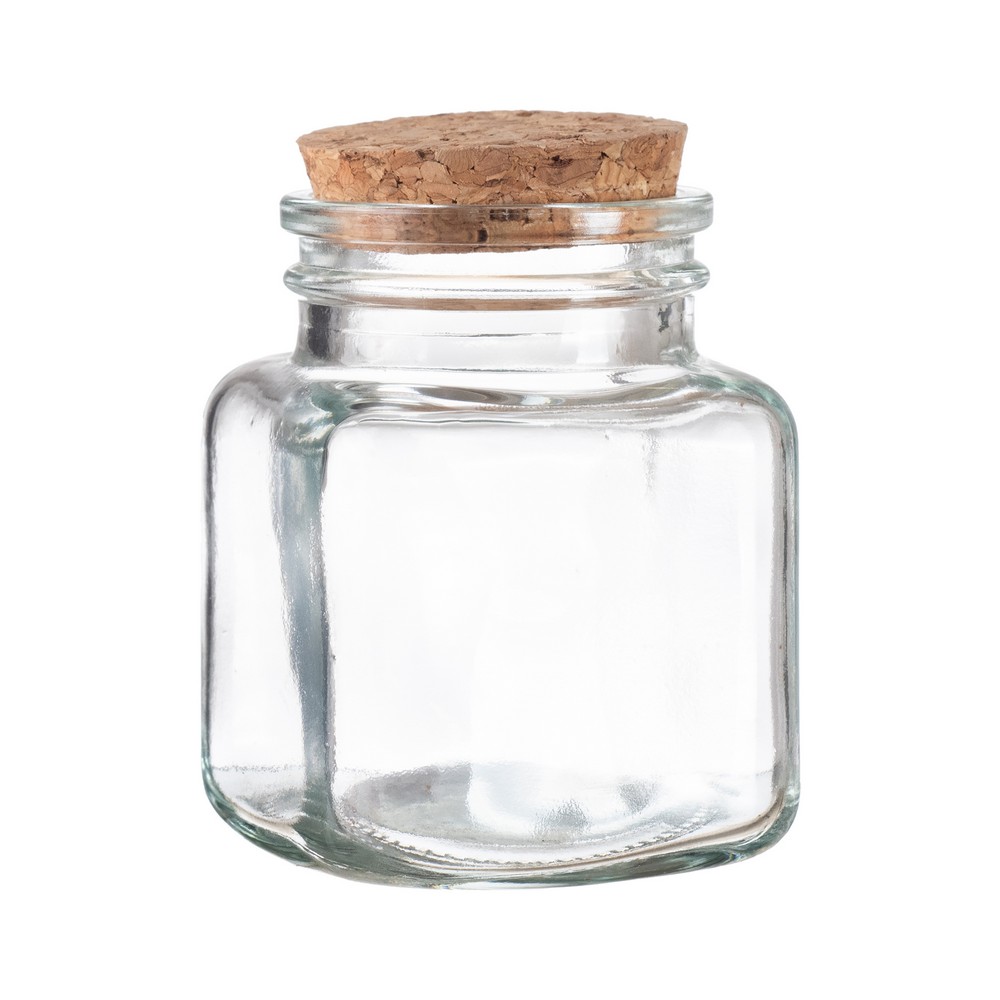 Γυάλινο τετράγωνο βαζάκι χαμηλό με κούμπωμα από φελλό.