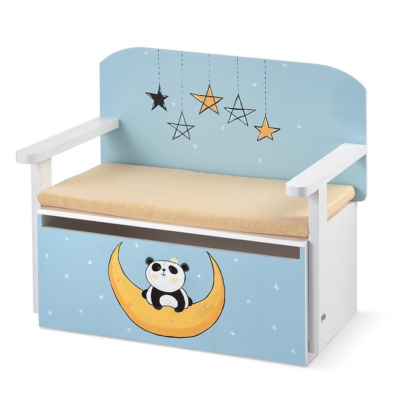 Ξύλινο λευκό παγκάκι-θρανίο,συσκευασία βάπτισης ζωγραφισμένη στο χέρι με θέμα το μικρό panda.Το μπροστινό μέρος του κουτιού είναι ζωγραφισμένο με baby panda καθιστό πάνω σε φεγγαράκι κίτρινο ενώ το φόντο από πίσω είναι σιέλ με αστεράκια λευκά.Την πλάτη διακοσμούν ζωγραφιστά κρεμαστά αστεράκια πάνω σε φόντο σιέλ με αστεράκια λευκά,ενώ το πίσω μέρος επίσης διακοσμεί ζωγραφιστό φεγγαράκι με αστεράκια πάνω σε φόντο σιέλ.Το κάθισμα του κουτιού διακοσμείται με μαξιλαράκι ντυμένο με ύφασμα μπεζ.